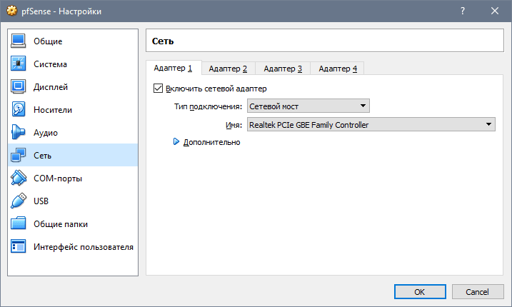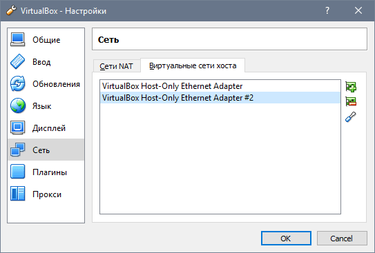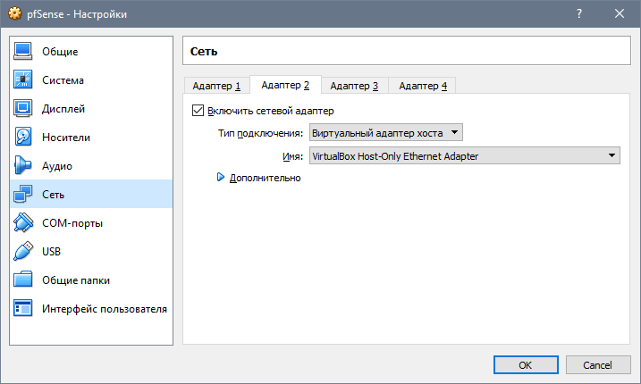 В моем случае будет 2, 1-ый для "LAN" - локальная сеть, 2-ой для "VBOX" - локальная сеть для виртуальных машин.Открываем VirtualBox и переходим в "Файл"->"Настройки"->"Сеть"->"Виртуальные сети хоста" нажимаем на значек с изображением "+". Если нажать на значек с изображением "отвертка", то можно задать параметры получения статического IP и включить DHCP сервер. В нашем случае, оставим все как есть, т.к. IP адрес мы будем получать от DHCP сервера pfSense.