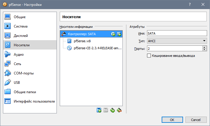 - [3] Носители информации. Добавляем контроллер "Sata" и подключаем к нему образ жесткого диска ".vdi и привод оптических дисков ".iso". Контроллер "IDE" нам не нужен.
