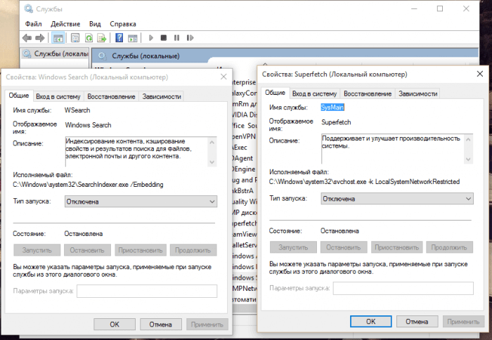 - Отключить Superfetch и поиск Windows