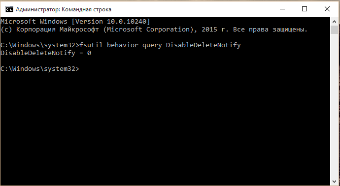 - В командной строке наберите «fsutil behavior query DisableDeleteNotify»