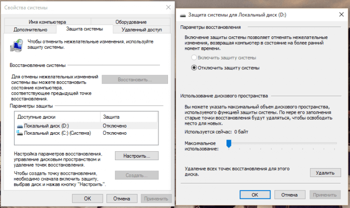 1. Отключить защиту системы (System Restore)