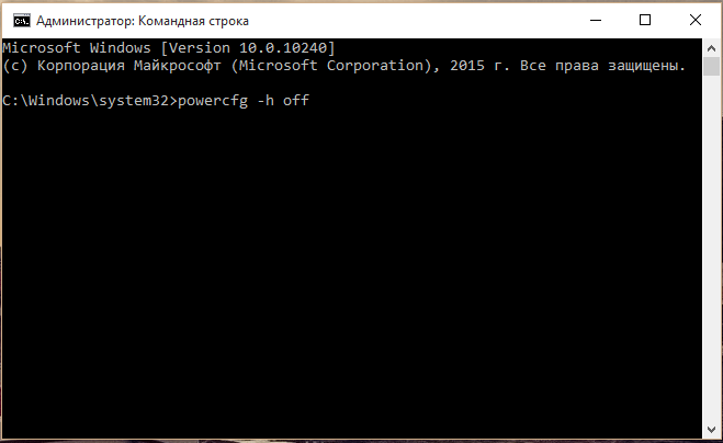 - В командной строке наберите «powercfg -h off». При наборе команды не включайте кавычки.