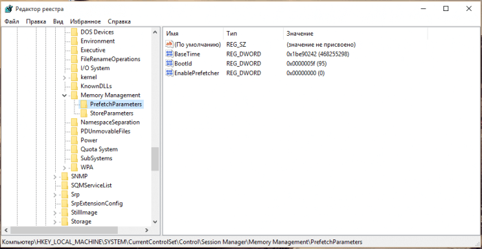 - Выберите пункт; «HKEY_LOCAL_MACHINE\SYSTEM\CurrentControlSet\Control\SessionManager\Memory Management\PrefetchParameters»