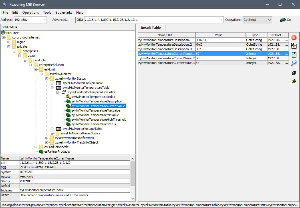 # - File -> Load MIBs -> ZYXEL-HW-MONITOR-MIB.mib: