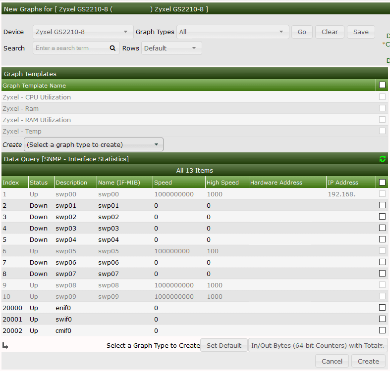 Теперь пролистываем ниже и смотрим что появились новые настройки. В "# Associated Graph Templates" добавились шаблоны графиков из шаблона устройства. А в "# Associated Data Queries" добавим (Add Data Query) - SNMP - Interface Statistics. Далее жмем "Save" и в самом верху на "Create Graphs for this Device".