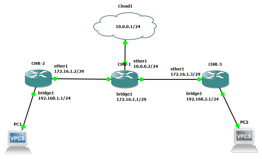 - CHR3: ether1 - 172.16.1.3/29, bridge1 - 192.168.2.1/24