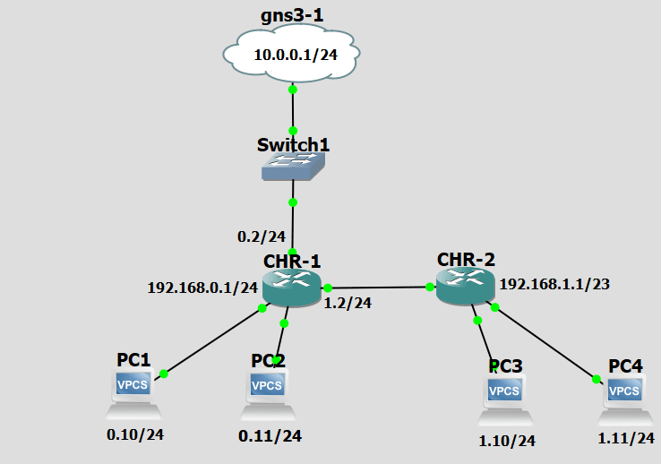 - CHR2: ether1 - 10.0.0.3/24, bridge1 - 192.168.1.1/23