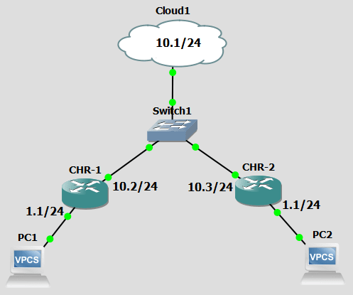 - CHR2: ether1 - 10.0.0.3/24, bridge1 - 192.168.1.1/24, l2tp-user1 - 172.16.255.2, virtual - 172.16.2.0/24