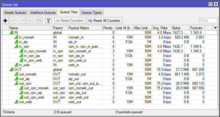Рассмотрим примеры настройки Simple Queues (Простых очередей), SQ+Mangle (Простые очереди с маркировкой соединений и пакетов) и Queues Tree (Деревья очередей).