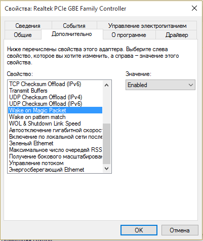 Проверяем, включена ли опция. Она позволит сетевой карте, даже при выключенном компьютере, ждать пакет на включение. Для этого переходим: Панель управления -> Центр управления сетями и общим доступом -> Изменение параметров адаптера -> Ethernet. Далее переходим в свойства, настроить, вкладка дополнительно и проверяем включена ли опция Wake on Magic Packet.
