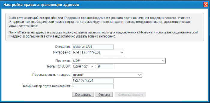 Выделяем IP-адрес, не использующийся в сети (в нашем случае это 192.168.1.254), и пробрасываем на него порт UDP 9 (данный порт используется по умолчанию для WOL-пакета).