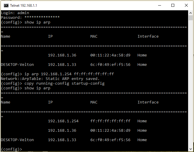 ip arp 192.168.1.254 ff:ff:ff:ff:ff:ff
