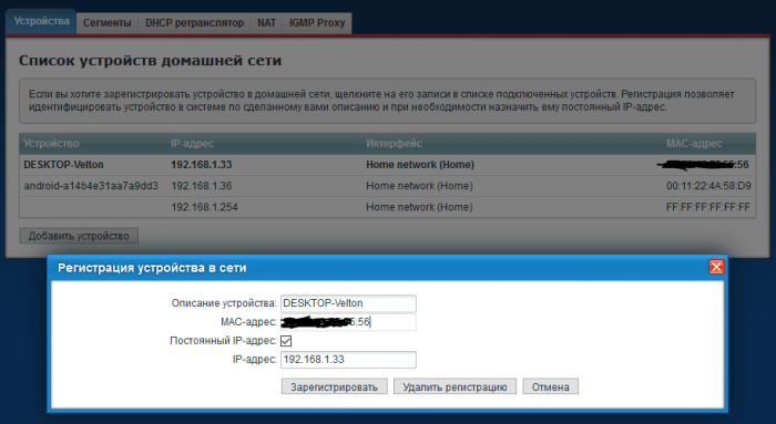 - Подключаемся к нашему маршрутизатору через веб интерфейс. И закрепляем за компьютером IP адрес. Домашняя сеть -> Устройства.