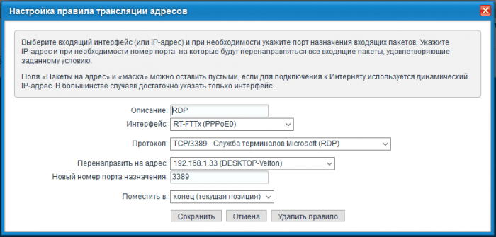- Далее переходим в раздел Безопастность -> Трансляция сетевых адресов (NAT) и добавляем новое правило как показано на скриншоте.