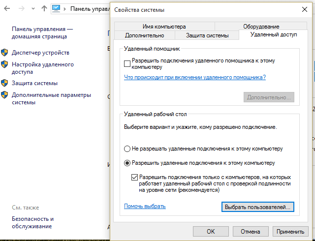 - Теперь переходим к настройке непосредственно ОС. Для этого переходим в Панель управления -> Все элементы панели управления -> Система -> Дополнительные параметры системы -> Удаленный доступ. При необходимости выбираем пользователей.