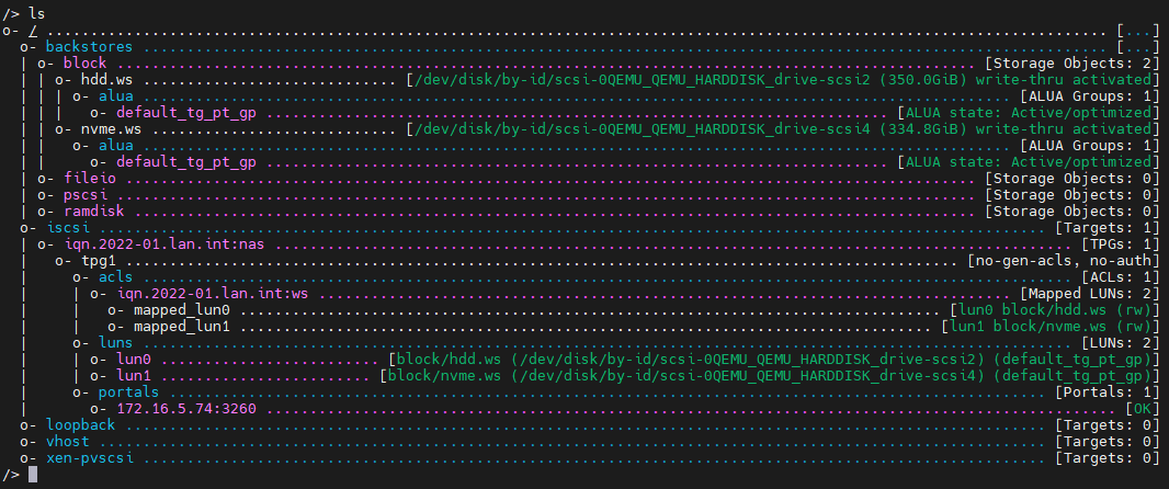 /> /iscsi/iqn.2022-01.lan.int:nas/tpg1/acls/iqn.2022-01.lan.int:ws create mapped_lun=0 tpg_lun_or_backstore=/backstores/block/hdd.ws